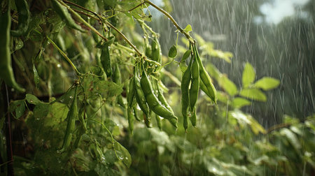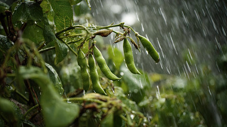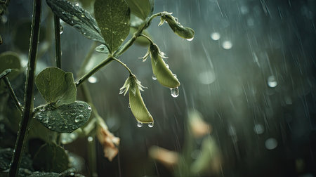 Mung bean in a storm, heavy rain pouring down, strong winds twisting their leaves