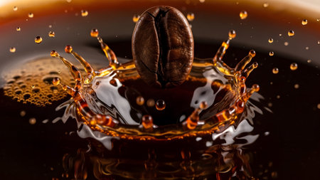 A coffee bean hovers above a dark, rich coffee splash with droplets frozen in motion, close-up view.