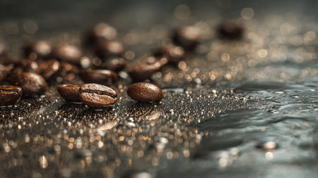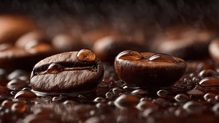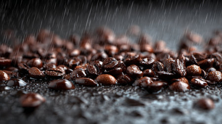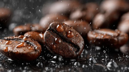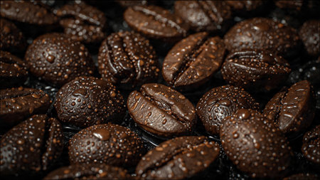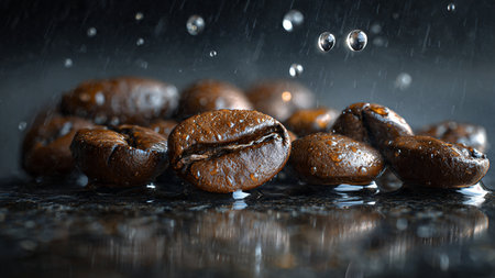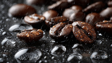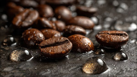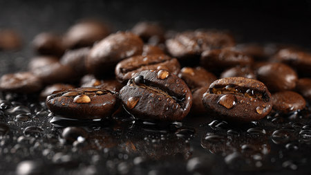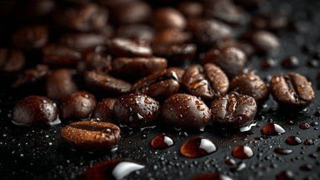 Coffee beans on a dark background with water drops, close-up