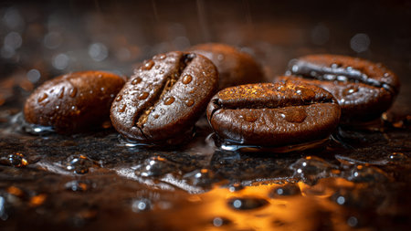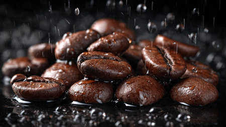 Coffee beans on a black background with water droplets.