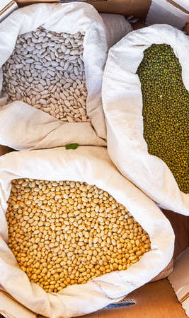 Different types of beans of various colors in sacks for sale in bulk at a local flea market grown in nearby orchards