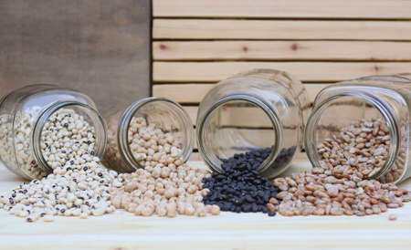 Glass jars with chick peas and kidney beans