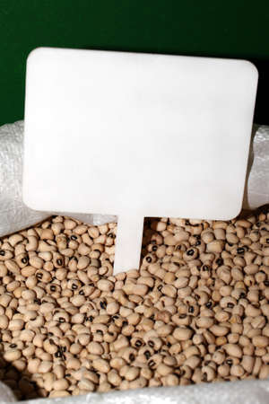 Lima beans in a sack with a black label