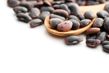 red kidney beans in wooden scoop isolated on white background close up, top view