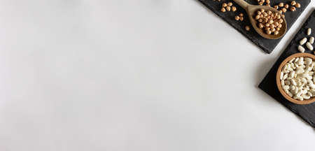 Multicolored bean scatter on white background. Healthy food banner template with text place. Kidney bean ornament on table. Nutritive dish ingredient photo for cook or recipe book