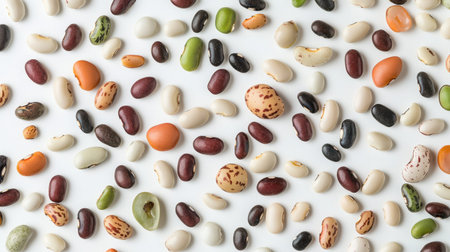 An artistic arrangement of various beans laid on a white background, highlighting their unique colors and textures, perfect for food enthusiasts and health-conscious individuals.
