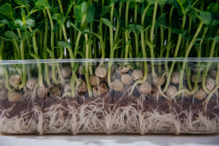 Close-up of peas microgreens. Growing microgreen sprouts close up view. Germination of seeds at home. Vegan and healthy eating concept. Sprouted seeds, micro greens.