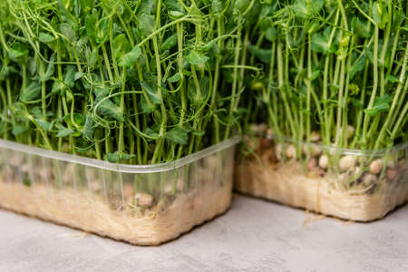 Fresh pea microgreens in a plastic container. Growing healthy greens at home. Juicy pea microgreens close-up
