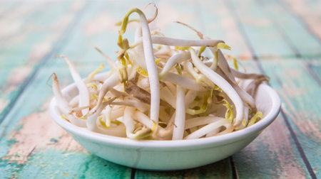 Preserved Soy Sprouts (close-up shot) on wooden background