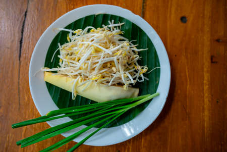 Stir Fried Bean Sprout in plate on wood background close up, top view, vegetarian food concept.