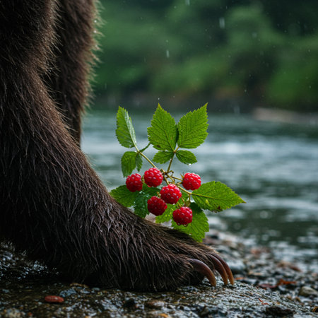 Bear and raspberry on the shore of a mountain river in the rain