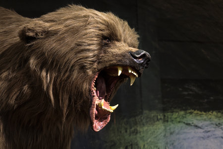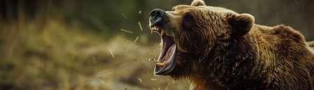 Powerful brown bear with open mouth, showing its teeth and roaring, captured in a natural setting
