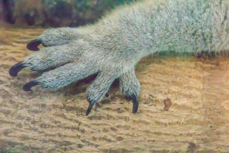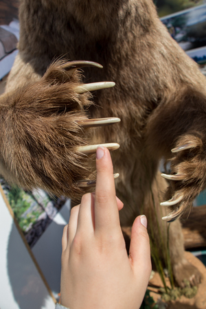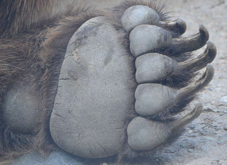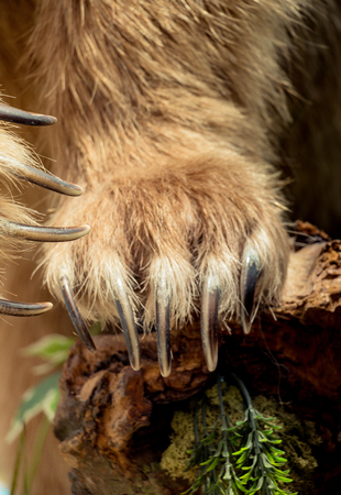 Sharp powerful bear claws on the front paw close-up. The forelimb of a brown Kamchatka bear.