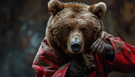 Bear in red gi, ready to fight, intense look, closeup