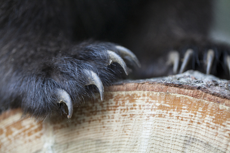 Close up bear cub paws with claws detail on cut spruce wood