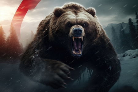 red bear in winter forest, angry bear with russian flag attack the world, AI Generated