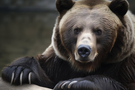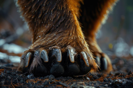Close-up of a brown bear paw with sharp claws resting on rock, symbol of strength, power and wildlife