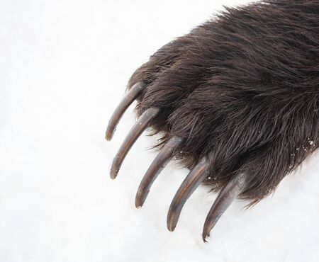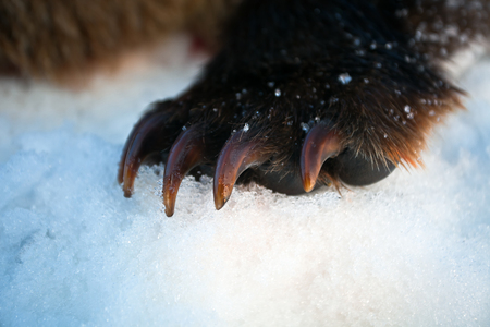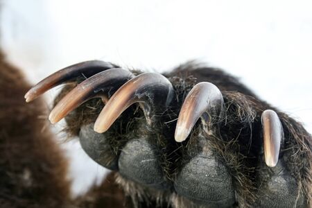 Long bear claws on the front right paw. Kamchatka bear claws on the background of spring white snow.