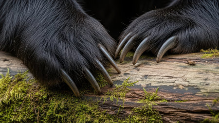 Close-up of bear claws on mossy log in forest wilderness.