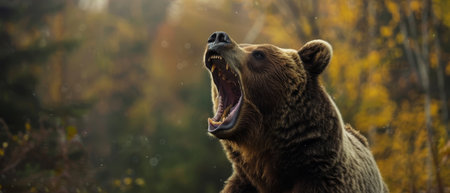 A detailed close-up of a ferocious brown bear roaring amidst the autumnal forest, capturing the raw power of wildlife.