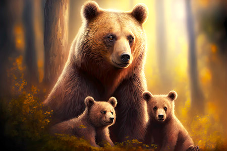 Bear cubs and mother she-bear in the summer forest. Bear family of Brown Bear (Ursus arctos).