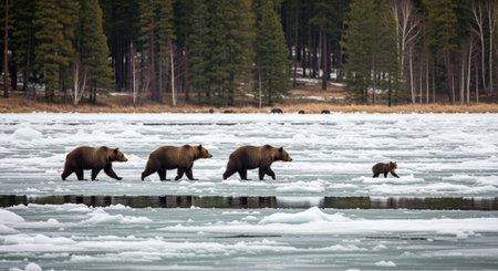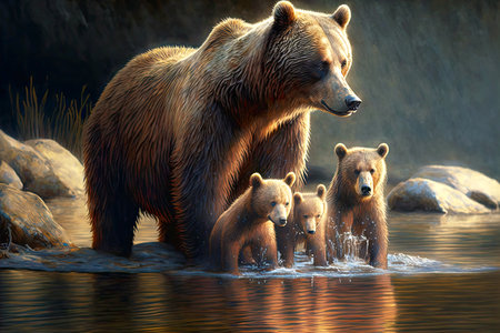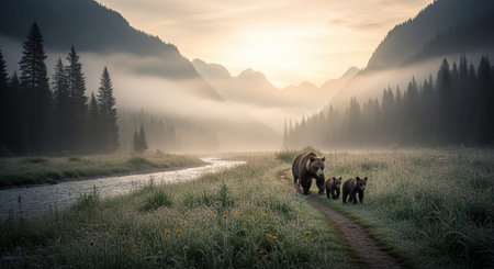 A grizzly bear family strolls along a riverbank at sunset. Breathtaking wildlife scene