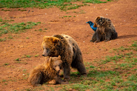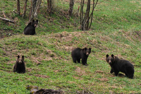 Family of brown bear, ursus arctos,s with adult mother and four cubs playing on meadow in spring. Group of mammals jumping in nature. Concept of animal love.