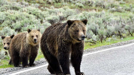 Mother Grizzly bear and two cubs crossing the road in Yellowstone National Park.