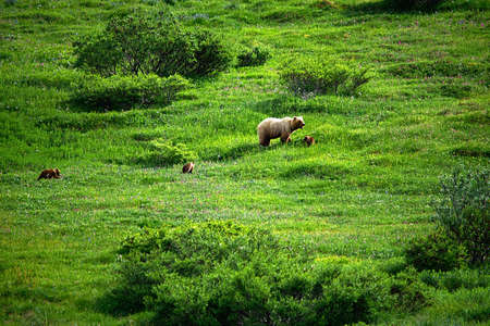 She-Bear and Cubs of Brown bear (Ursus Arctos Arctos) on the swamp in the summer forest. Natural green Background