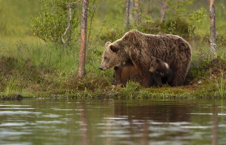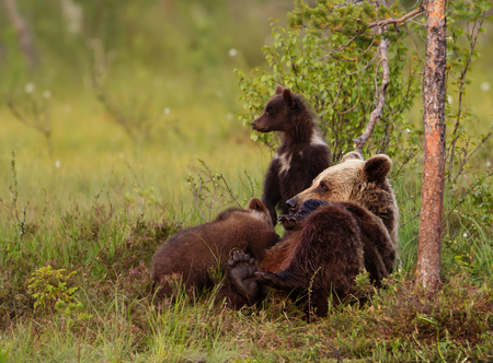 She-bear and bear-cubs. Adult female of Brown Bear (Ursus arctos) with cubs on the swamp in summer forest.