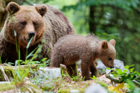 Brown bear - close encounter with a big mother wild brown bear with her cub walking in the forest and mountains of the Notranjska region in Slovenia