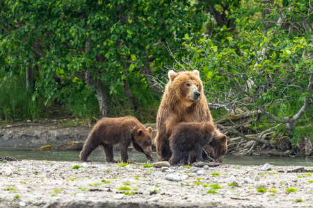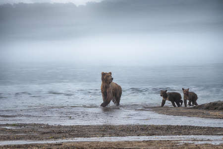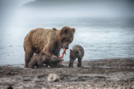 Kamchatka brown bear female and bear cubs catch fish on the Kuril lake. Kamchatka Krai, Russia.