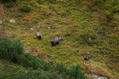 Wild brown bear mother with her cubs walking and searching for food in the forest and mountains of the Notranjska region in S
