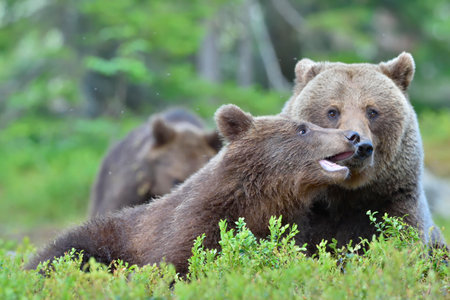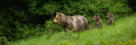 brown bears. She-bear and bear-cubs in the summer forest. green forest natural background. Scientific name: Ursus arctos.