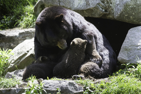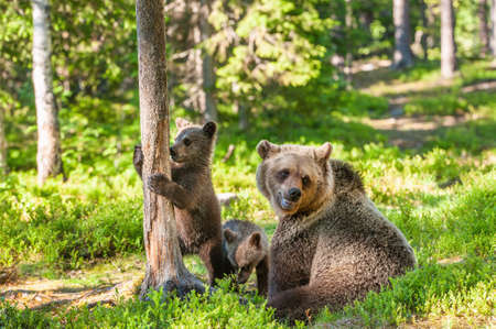 She-bear and bear-cubs. Adult female of Brown Bear (Ursus arctos) with cubs in the summer forest.