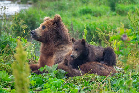 A female brown bear and her cubs lie in the grass, Kamchatka, Russia