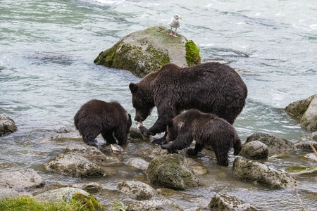 Grizzlys fishing salmon in the river in Alaska before winter, mother with babies
