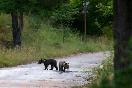 Brown bear cubs in summer forest. Scientific name: Ursus Arctos. Green natural background. Natural habitat, summer season.