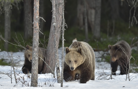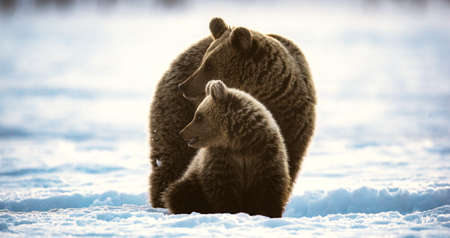 She-bear and bear cubs in winter. natural habitat. Brown bear, Scientific name: Ursus Arctos Arctos.