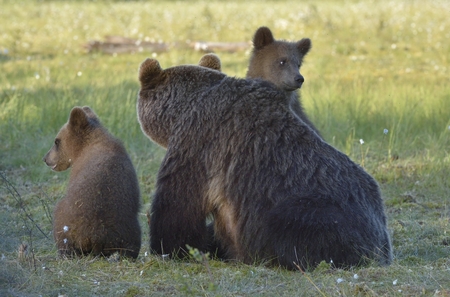 A mother bear and her three cubs in the middle of the cotton grass in a Finnish bog