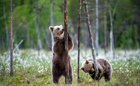 She-bear and bear cubs in the summer forest on the bog among white flowers. Natural Habitat. Brown bear, scientific name: Ursus arctos. Summer season.