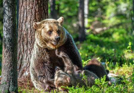 Brown Bear (Ursus arctos) with Bear-cubs on a Pine tree. Spring forest.