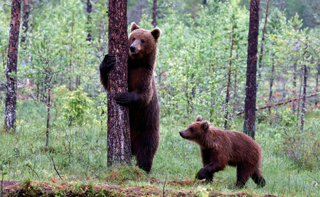 Eurasian brown bear cubs playing with a mom by the pond, Finland.