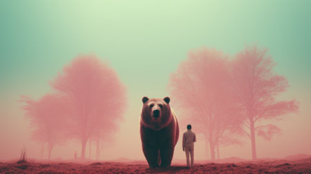 A breathtaking scene depicting a man standing before a colossal bear in a misty forest, evoking feelings of awe and respect for nature's power and beauty.