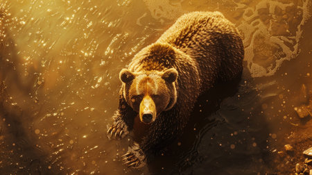 An overhead view captures a powerful grizzly bear standing in golden water, illuminated by sunlight.