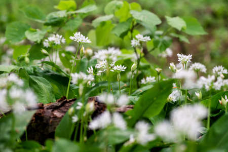 Flowering ramson, Allium ursinum. Blooming wild garlic plants in the woodland in spring - selective focus