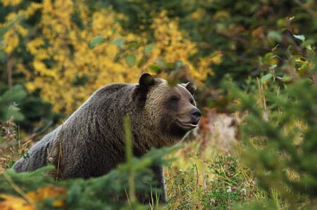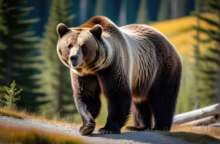 North American grizzly bear roams through the forest. wild predator in its natural habitat