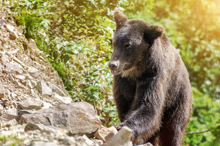 Brown bear on the top of the mountain. Sunset in the mountains