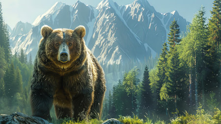 Majestic Bear Sitting on Green Hill Against Mountain Backdrop with Soft Mist and Beautiful Nature Surroundings in Morning Light