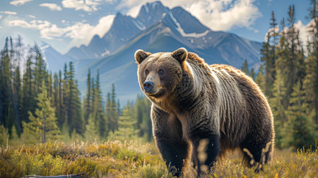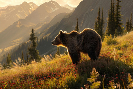 A grizzly bear standing tall in a lush mountain meadow
